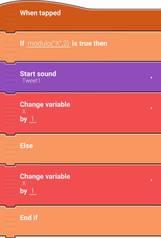 If this is the case, the sound Tweet1 is played and the variable X is incremented by 1.