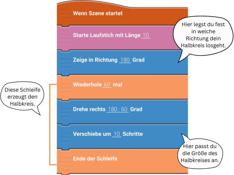 180 bleibt dabei bei einem Halbkreis immer gleich! Du musst also die Wiederholungen passend einstellen, wie hier 60. Probiere andere Kombinationen aus! z.B.: 30 und 180 ÷ 30 oder 180 und 360 ÷ 120.