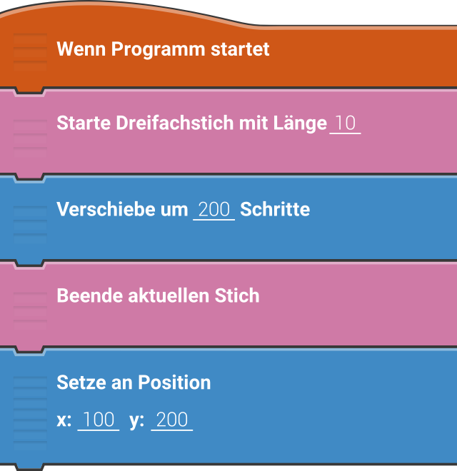 Diesen Baustein braucht man, wenn man nach einem Lauf-, Zickzack- oder Dreifachstich die Position der Stickmaschine ändern will.